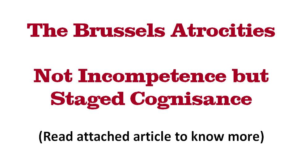 Note: Appended to my piece above, here is a link to an article today cataloguing the so-called “blunders” of the Belgian authorities, including having but ignoring the knowledge of the whereabouts of terrorist leader, Salah Abdeslam for 3 weeks! http://dailym.ai/1SkThLy . No way are these “blunders”. It is all deliberate. Notice also how the anonymous policewoman informant says: “Every day we arrest well-known criminals and the next day they are back on the streets. It is frustrating that we are doing our work but the justice system doesn’t back us up. These people are not being prosecuted or fined, they are just being released. We arrest them and nothing happens to them.” Ever wondered why that would be? Think about it. Belgium is an extremely corrupt country, with Brussels (the “capital” of Europe) at the top of the shitheap — full of paedophiles among the elite in the political/judicial system. Wait till the chemical/biological/ nuclear weapons start exploding in public places — all planned by your “security” services and using these psychopathic jihadis to do the dirty-work. Do not be afraid. They feed on your fear.
