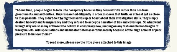 At one time, people began to look into conspiracy because they desired truth rather than lies from governments and authorities. They researched diligently in order discover that truth, or at least get as close to it as possible. They didn’t do it to big themselves up or boast about their investigative skills and they certainly didn’t hurl insults at anyone who disagreed with them. They simply desired honesty and transparency and they refused to accept a narrative of lies and cover-ups. So what went wrong? Why are so many of those who believe in conspiracy now jumping on any fashionable bandwagon of wacky beliefs, wild speculations and unsubstantiated assertions merely because of the huge amount of peer pressure to believe them?