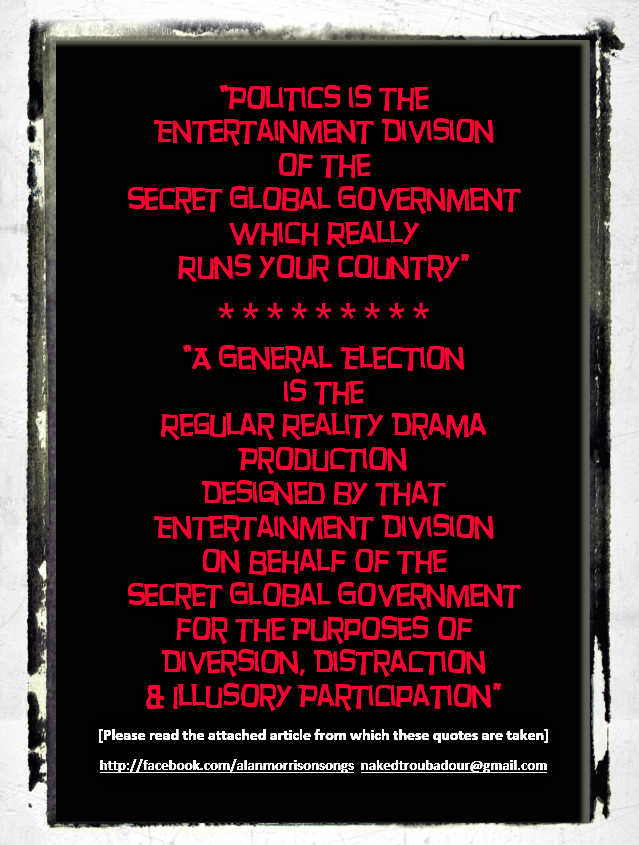 The way that the power-elite (secret global government) works in human affairs is like this: The law enforcement, military and security services are responsible for implementing and enforcing the plans of that secret government. Then the politics that people take so seriously is simply the “entertainment division” of the secret global government which really runs your country, providing entertainment for the masses, so that they imagine they are participating in some kind of “democratic” choice of government. Alongside of this, the mainstream media is the “propaganda division” of the secret government. Thus, there is a kind of “triumvirate” of departments or divisions acting exoterically on behalf of the secret government in this world: The Enforcement Division, the Entertainment Division and the Propaganda Division. This is how they keep everything covered. The Enforcement Division involves law enforcement, military & security services. The Entertainment Division involves politicians, governments, parliaments, senates & congresses. The Propaganda Division involves newspapers, journals, TV & news corporations. For the real power in this world does not lie in the elected people in your parliaments and senates. A general election is the regular reality drama production designed by that entertainment division on behalf of the secret global government for the purposes of diversion, distraction and illusory participation. Thus, elections and the subsequent workings of parliaments and senates are merely one huge charade, acted out in order to anaesthetize the mass of people into a crippling mindset of ignorance and illusion. The lower grade of politicians are unaware of this and imagine they have autonomy to change the world. But the higher up the scale one goes, the more they know very well the charade in which they are participating. The reality is that democracy is entirely non-existent on this planet.