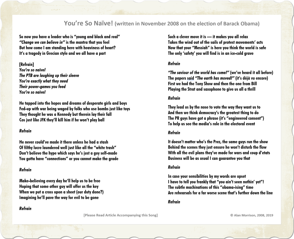 When Obama was first elected in November 2008, and the world was in ecstasy, I wrote the song which you can see in the image accompanying this article, “You’re So Naïve!” It soaked up a lot of hate, mostly from resentful obama supporters who believed that “the world had its vibration frequency ramped up” by his election! My use of the term “mantra” in the first verse is no exaggeration. For Obama can be shown to have used identifiable hypnotic techniques in his speeches with which he wooed his audiences and had them eating out of the palm of his hand. In fact, a very interesting 67-page analysis of Obama’s speeches has been carried out by an expert in hypnotism who believes that they deliberately used hypnotic techniques in order to enrapture the audiences. [See http://www.scribd.com/doc/7470439/Obamas-Use-of-Hidden-Hypnosis-Techniques-in-His-Speeches ] This is well worth reading. This analysis is supported by many other experts in hypnosis — especially in Neuro-Linguistic Programming. A certified master hypnotist and trainer of hypnotherapy decided to analyze speeches from each of the candidates. He wrote: