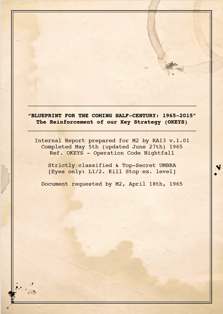 Here is the context of the attached document in the book:- At a secret meeting of the North European branch of Reluctant Angels (RAGS) in a disused quarry in near Šaltiškiu in Lithuania, Karelija Šviečiantys — a RAGS operative who has responsibility in the group for obtaining secret information about the power-elite — announced her discovery of a staggering document in the basement of an abandoned building outside Washington DC, entitled “Blueprint for the Coming Half-Century (1965-2015)”. This appeared to have been a policy report compiled in 1965 by a research assistant, then known as RA13, who became a rising star in the formulation of the Key Strategy (OKEYS) of an increasingly widespread underground “black operations” unit — whose operational members soon came to number nearly 50,000 — which was buried deep within the US intelligence ‘community’, with members from the Pentagon (DOD), Fort Meade, Maryland (NSA) and Langley, Virginia (CIA). There are operational connections also with Mossad, MI6 and other European intelligence networks. The document itself plots out with tentacular meticulousness, in advance (from a 1965 standpoint), the strategy which would be used by the covert ‘black ops’ organisation and its successors through its agents and assets for the ensuing half-century, 1965-2015, showing how it has been manipulating events and utilising mind-control and social control activities in order to achieve its ultimate stated goal, which was: “the establishing of an autocracy under a single world leader, answerable only to MRY, to be accepted willingly by all as ‘good and necessary’ for a secure world — all to be accomplished, if all goes to plan, during the 2020s (Code Nightfall)”. The Reluctant Angels did some considerable research to discover the identity of “MRY”. Eventually, thanks to the spiritual input of Paul Altara (formerly the Revd. Paul Altara), it was discovered that “mry” is a transliteration of the Aramaic word for “to have dominion” or “to lord it over”. It is related to the Aramaic word “marya”, which is used for the Tetragrammaton or name of God and was frequently used to refer to Christ. But MRY is clearly a dark counterfeit which falls well short of MARYA (just as 666 falls short of 777 — let the reader understand), which links very neatly in with another way that “mry” can be used in Aramaic, which is to signify “rebellion”. Paul Altara therefore posits that the “single world leader” mentioned in the document can be none other than the Antichrist and that MRY is clearly Satan, who is described in the Book of Revelation (chapter 13, verse 2) as having given the Beast “his power, his throne, and great authority to rule”. That “Beast”, says Paul Altara, “is clearly synonymous with the “man of lawlessness” described in the Second Letter to the Thessalonians (who is taken by many to be a reference to the Antichrist), and who is also described as coming exclusively “as a result of Satan’s working” (literally translated as Satan’s energising). This is surely the context in which the document says that the “world leader” is “answerable only to MRY”.