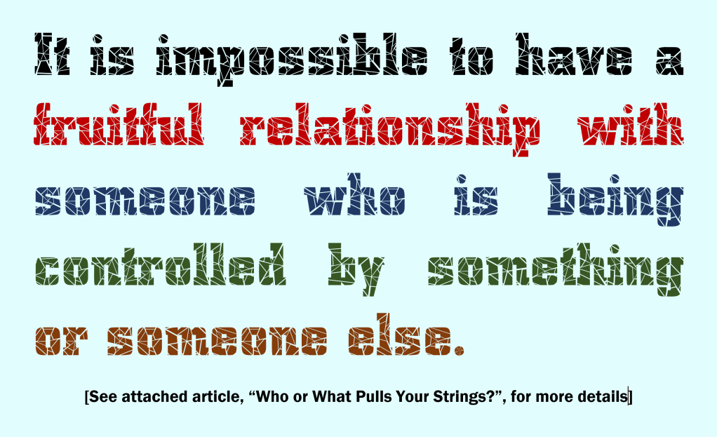 A very obvious example would be where a teenager falls under the controlling nature of a new-found friend of the wrong kind who turns his or her mind against the parents who then find they can no longer have any decent relationship with their son or daughter. The youngsterās strings are being pulled, puppet-like, by the new āfriendā. An external force is in control. Another obvious example would be the old mother-in-law āchestnutā whereby a husband cannot have a fruitful relationship with his wife because she is still being controlled by her mother (or vice-versa because the husband is āunder the thumbā of his mother). Someone else is pulling the strings. Another example would be where, say, a daughter is unable to relate to her father anymore because her new boyfriend is threatened by the influence of the father and has manipulatively planted negative ideas in the daughterās head about her father. The daughter probably wouldnāt even recognize what was happening and will just imagine that she has outgrown her father. But the father can no longer relate to the daughter because her thinking is being controlled by someone other than herself. A relationship has been undermined through the daughter giving her strings (which she alone should control) into the hands of another ā in this case, a manipulative, controlling boyfriend.