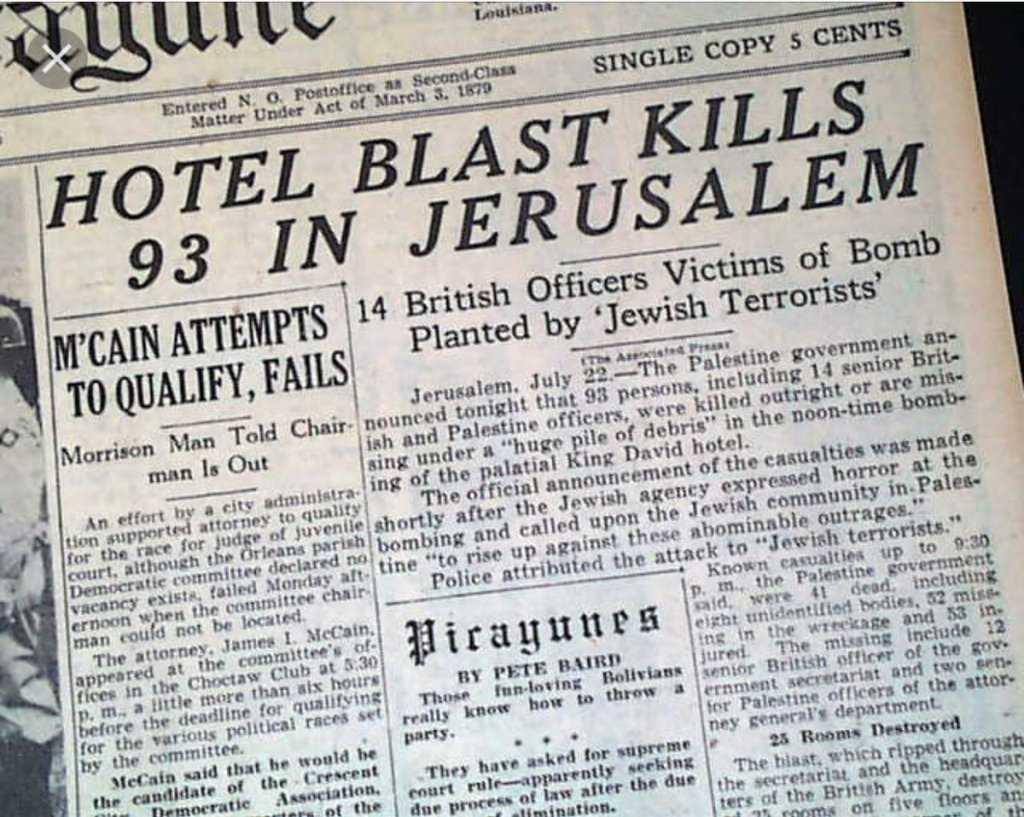 It was not a miracle which brought Israel today into existence (as is often naively claimed by Christian Zionists). In fact, the current state of Israel was pushed and bullied into place by a mixture of skilful lobbying and outright terrorism. It would be no exaggeration to say that the Israel we know today was literally gunned and bombed into existence by violent actions on the part of terrorist gangs every bit as evil and ruthless as were the IRA in Ireland, the Bader-Meinhof group in Germany or as al-Quaeda is made out to be today. If al-Quaeda actually claimed to have started an Islamic State or Caliphate based on their terrorist agenda, it would be accorded pariah status as a terrorist regime! But not Israel, which was given great assistance and support from Western nations to establish their regime. The Jewish terrorists which forced the Jewish state of Israel into being were the Irgun Gang [http://www.etzel.org.il/english/index.html ] and the Stern Gang (aka Lehi) [http://en.wikipedia.org/wiki/Lehi_(group) ]. Many of those who founded the state of Israel were terrorists from those groups in the same mould as many of those who have been languishing as accused terrorists in Guantanamo Bay and other US rendition detention centres. For example, the former Israeli Prime Ministers Menachem Begin (Irgun Gang) and Yitzhak Shamir (Stern Gang) were both terrorist extremists who fomented murder before Israel was founded as a state. Shamir, a leader of the Stern Gang, ordered the assassination of Lord Moyne who was gunned down in Cairo in 1944. In a 1998 interview with the Daily Telegraph, Shamir said that he “would have been happy to kill Lord Moyne himself” (Daily Telegraph, April 18th, 1998, p.20). On July 22nd, 1946, the Irgun Gang blew up the King David Hotel in Jerusalem, killing ninety-one and injuring forty-six people (see image above).