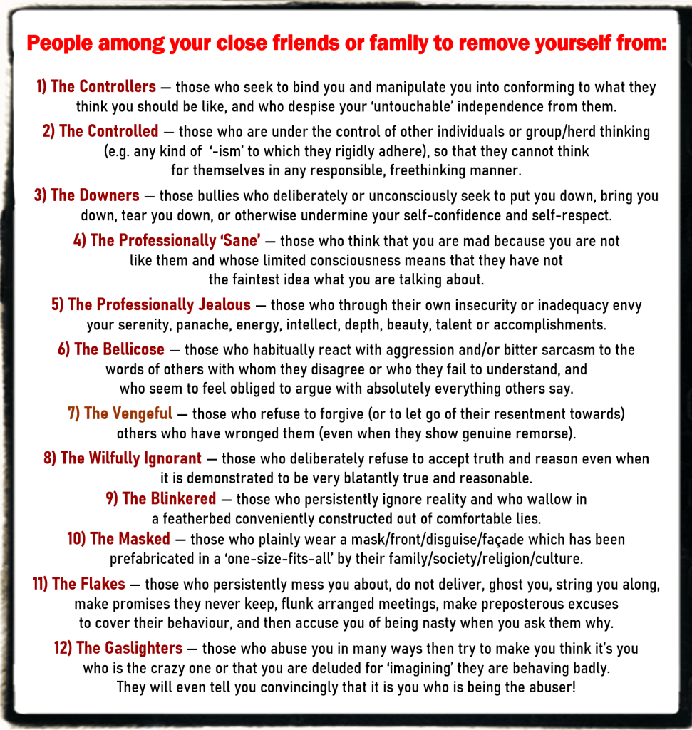 I’VE BEEN MAKING THESE IMAGES AGAIN. Not a ‘meme’, strictly speaking; but consider it a prose poem, if you will. It is our solemn duty to free ourselves of such traits of character. That is what self-awareness is all about. I am referring in the post to those who exhibit any one (or more) of those traits as an unchanging part of their character. As far as I am concerned, anyone who habitually emits such destructive behaviour has no place anywhere near my inner circle. Anyone who puts up with that will inevitably find themselves in a codependent relationship where growth becomes impossible. I’ve uncritically allowed too many of such people to remain in my life in the past, all out of a misplaced patience and compassion. Inevitably, they will be time-wasters and will drag you down to their level.