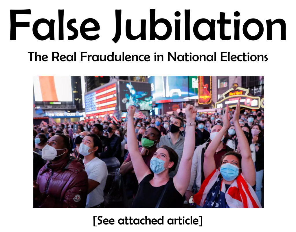 SO MANY ARE NOW CROWING WITH JUBILATION at the potential change of president in the USA (dependent on the outcome of any paranoid applications to courts to reverse the current presidential claims). I have witnessed such jubilation before many times during my life, but I have never involved myself with any of it.
