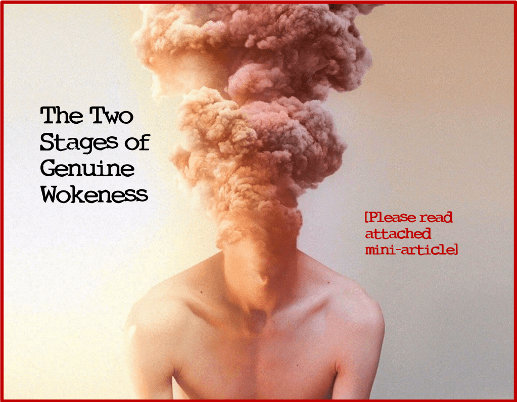 I could write a whole book about this. Some may say that I already have. But, for now, suffice it to say that genuine wokeness comes in two stages. Maybe you are reading this and have not yet even embarked on the first stage. Maybe you have embraced the first stage but have not yet progressed to the second. It is my fervent wish that you will not only embrace genuine wokeness, if you have not done so already, but that you will go on to embrace the second stage of it as a confirmation of completeness — though I am aware that even the second stage is merely a precursor to countless epiphanies which lie beyond that stage and which will take us into a regenerated creation in a new aeon.