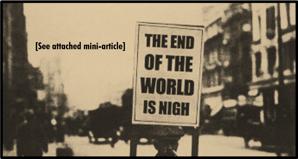 NO DOUBT YOU ARE FAMILIAR WITH THE PHRASE, “The end of the world is nigh”, or you may have seen it written on a sandwich-board donned by a religious fundamentalist in the street. However, rather than “The end of the world is nigh”, it would be more accurate to say, “The end of this age is near”, as it has to give way to the new, when this world will be supernaturally morphed into a totally transformed new heaven and new earth (fully transfigured cosmos and hugely raised dimensionality). And so it should be. We should not want to stand in its way. The world as we know it was never meant to be the final state of this creation. This world as it is now is merely transitory — a fleeting cosmic theatre in which darkness (evil) must come to its climax so that it can all be supernaturally eradicated (as it surely will be by the Creator of this cosmos and those remaining faithful angels) when a new creation will arise out of the ashes of the old.