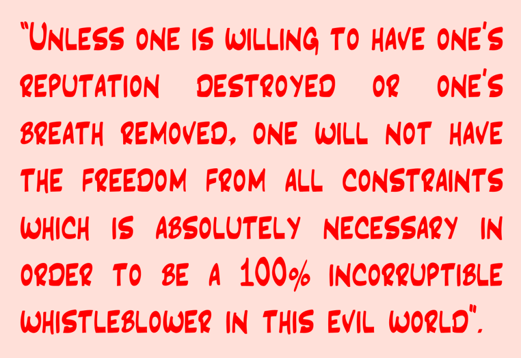 Here is the terrible reality: Unless one is willing to have one’s reputation destroyed or one’s breath removed, one will not have the freedom from all constraints which is absolutely necessary in order to be a 100% incorruptible whistleblower in this evil world. One must have no encumbrances whatsoever and nothing left to lose, or one could still be compromised. For if you stand up for truth in the midst of their lies, they will come for you, and they will do their best to find your weak spot, so as to deter you and break you. Whistleblowing is not for the fainthearted.