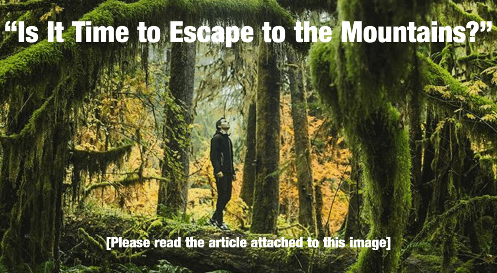 Somehow escaping to the mountains seems like a good thing for God’s people to do at this time (unless they are specifically called to remain in cities as forthtelling prophets). If cities are Babylon, then mountains are the nearest to heaven one can find on this earth. Governments, global organizations and health bodies set up to further the ends of the New World Order have paved the way during the last two years to establish even more authoritarian, tyrannical, paternalistic oversight, surveillance and control. Truly, the time could well be almost nigh to live way outside of cities and towns and probably even villages and find something, somehow, somewhere in the middle-ish of nowhere, to grow in quiet wisdom and with a bird’s-eye view of the desperate ways that humans do everything they spitefully can to avoid admitting who and what they really are, as their wilful spiritual blindness is established, corroborated, ratified, and finally sealed for eternity.