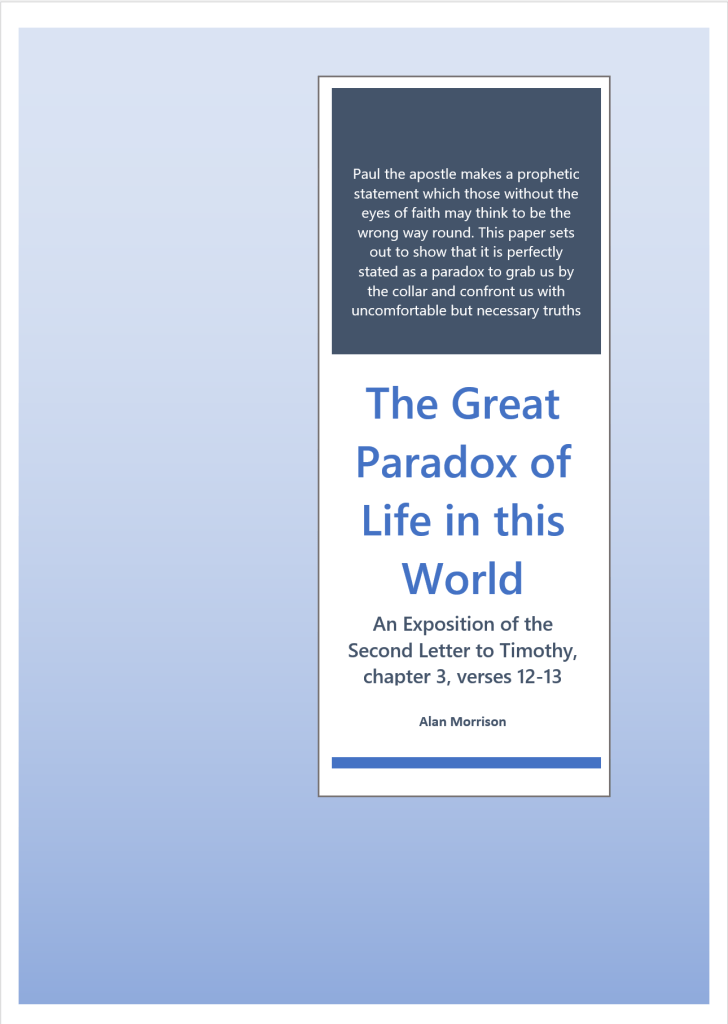 In this paper, I am going to ask a number of questions which could be raised about this text. 1) What is a devout life? 2) Why should those living a devout life ‘in Christ Jesus’ be persecuted? 3) Where would such persecution come from? 4) Is persecution all there is for those leading devout lives? 5) Why should evil people and impostors flourish?