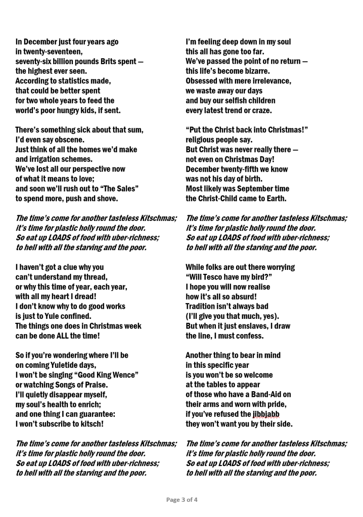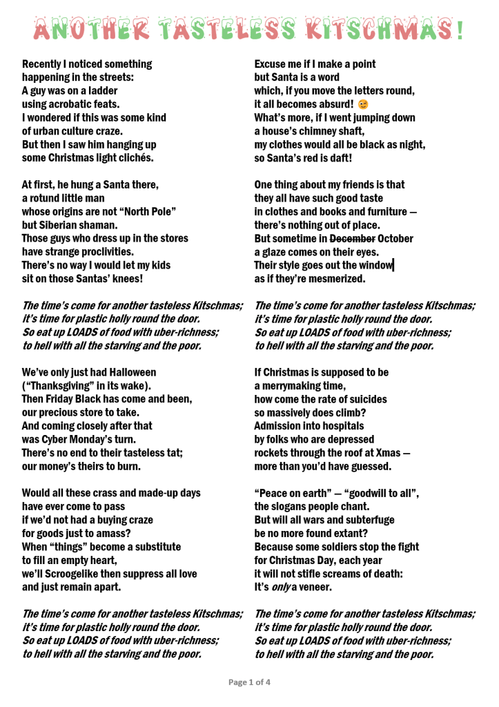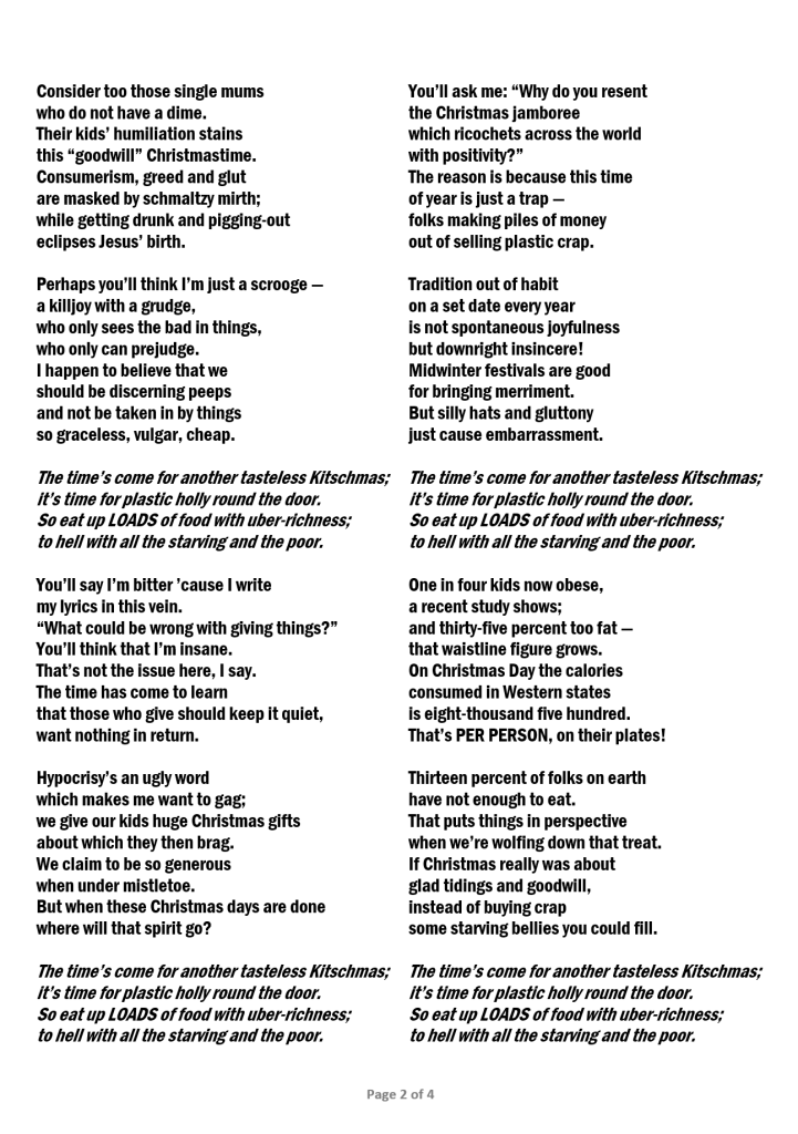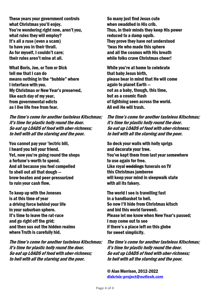 [THE TIME’S COME FOR ANOTHER TASTELESS KITSCHMAS! Each year, for the last 10 years, I have been adding more verses to a carol I am continuously writing. This year, I added another 2 verses and it now has 32 verses. (See the numbered 4 images below. This is the only card you’ll get from me!