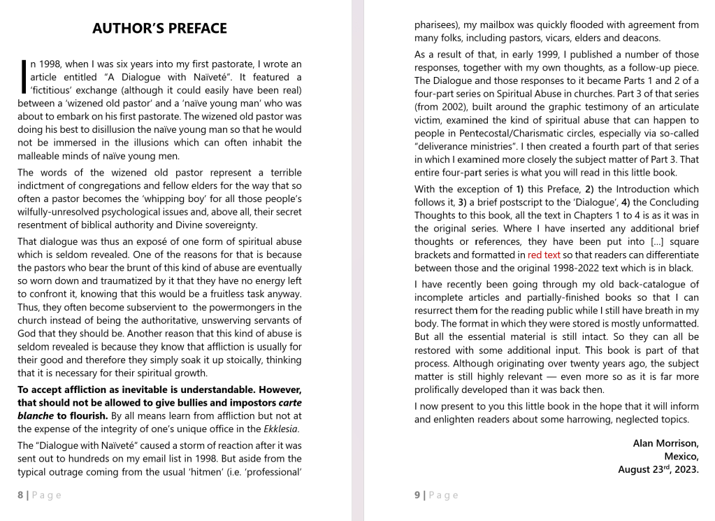 However, because that kind of abuse has been written about so extensively, the present book covers a couple of more suppressed but no less vicious or prolific aspects of spiritual abuse in churches. Namely, 1) The abuse of a pastor by the elders and/or members of the congregation and, 2) The abuse of members of a congregation through the prevailing religious practices of a church or organization which they have chosen for themselves.