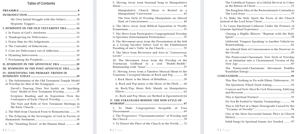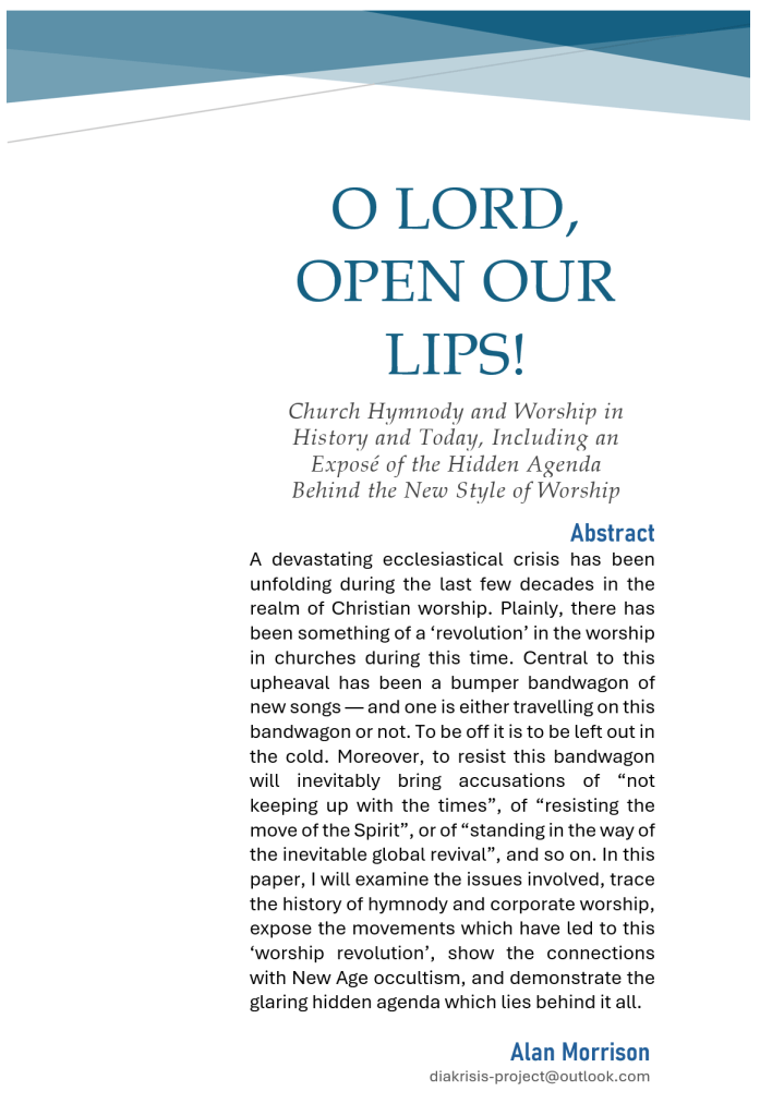 In this paper — which began life as a 12,000-word piece in 1997, was updated in 2000 to 22,000 words, and has just been expanded by a further 45% to 32,000 — I will examine the issues involved, trace the history of hymnody and corporate worship from the Old Testament to the present, expose the movements which have led to this ‘worship revolution’, show the connections with New Age occultism, and demonstrate the glaring hidden agenda which lies behind it all”.