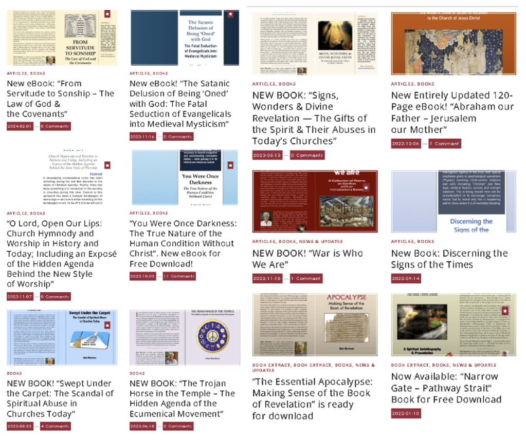 Dear Friends, Just to let you know that there are now 12 BOOKS available for free download from the Books category page of this website. (A link is given below). They cover a wide range of subjects, such as an autobiographical primer in basic Christian truth in the midst of a New Age world, a commentary on the Book of Revelation, an exposé of the Ecumenical Movement, an exposé of spiritual abuse in churches today, a spiritual and psychological examination of conflict on a personal and global level, the need to discern the signs of the times (with numerous examples of deception within and outside of the visible church), the true extent of human depravity, acceptable worship and hymnody, the modern Israel question (is it really a restoration of ancient Israel?), an examination of the misuse and abuse of the Spiritual Gifts (basically, an exposé of the Charismatic Movement), the seduction of evangelicals into mysticism, an examination of the difference between the Old and new Covenants (answering the questions, “Which one are we under?”, and “What is our rule of life?”).
