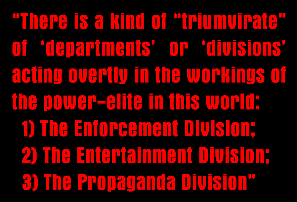How does all this operate and how is the system enforced and propagandised without you being conscious of it if you are ill-informed and unperceptive? Well, there are three ‘departments’ or ‘wings’ in the way that the power-elite (i.e. the secret and as yet unrevealed global ‘government’) imposes its will in the world. The way that the power-elite works in human affairs is like this: The law enforcement, military, contractors, intelligence agencies and security services are responsible for implementing and enforcing the plans of that secret ‘government’. Then the political arena that people take so seriously is simply the ‘entertainment division’ of the secret global ‘government’ (power-elite) which really already runs your country, providing entertainment for the masses, so that they imagine they are participating in some kind of ‘democratic’ choice of government. Alongside of this, the mainstream media is the ‘propaganda division’ of the secret ‘government’.