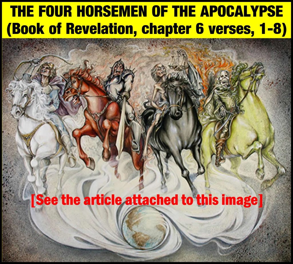 During my research and readings over the past few decades, I have found that there is a huge number of interpretations of these four horsemen. Some of them are reasonable and understandable (though not necessarily having the ring of truth), but others are so far out that I could only laugh at them. [See a classic example of this in a UK national newspaper at this link: https://tinyurl.com/4atkejwc ]. In such obviously symbolic passages, I am looking for what is the meaning which is most consistent with the rest of the Book of Revelation and with the Old Testament passages which have inspired those passages. We must never overlook the Old Testament influences on the Book of Revelation. For example, in the first chapter of the Book of Zechariah, four horses of various colours were sent out by God on a mission to check out what was happening on the earth. In that context, they were plainly angels carrying out cosmic ‘God-management’. We see the same principle in the other set of four horses in the sixth chapter of the Book of Zechariah. Thus, it is surely reasonable to assume that the use of the symbol of four horses here in the Book of Revelation also represents God’s management of affairs across this earth, which is what the sealed scroll is all about — how God manages the cosmos during this final age between the ascension of Christ and His second coming.