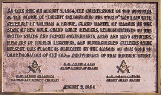 The torch in so-called Lady Liberty’s hand is, in fact, the Luciferic light “enlightening the world”, which Freemasonry reveres. The laying of the cornerstone of the Statue of Liberty on August 5th, 1884, was a totally Masonic ceremony convened by William A. Brodie, Grand Master of Masons in New York. The image below depicts the commemorative plaque laid by freemasons 100 years after the original stone-laying ceremony).