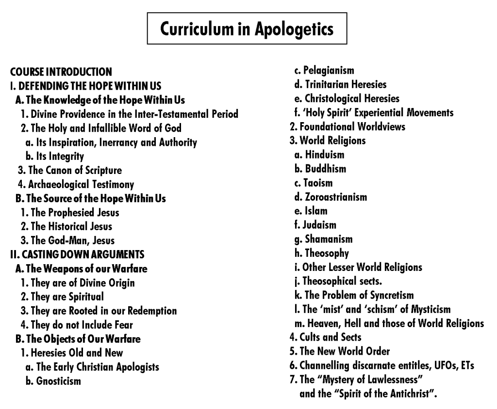 In the 1990s, I designed a 14-page outline document for a Curriculum on Apologetics which I intended to teach, but I was too busy with pastoral concerns and guest lecturing to fulfil it at the time. (I’ve attached the headings page of that Curriculum at the top of this article). I just nostalgically came upon that Curriculum in my archives and that is what has inspired this little piece. It is my belief today, just as much as it was then, that a great many Christians are not really equipped to give a defence for the hope which is in them, or to raise an offensive strategy to cast down arguments — to be “apologists” — though Peter and Paul commend us to do so in the above two Scriptures in stringent terms. A key thinking behind the development of that curriculum course was that it should not consist merely in the gathering of intellectual knowledge on philosophies, or in the bare identification of various schools of Christian Apologetics — as so often occurs in scholastic, ‘ivory-tower’ courses. Rather, it should be immensely practical in its outworking. In keeping with the Great Commission, the aim and substance of the course was, therefore, designed to provide a useful framework for successful evangelistic enterprise.