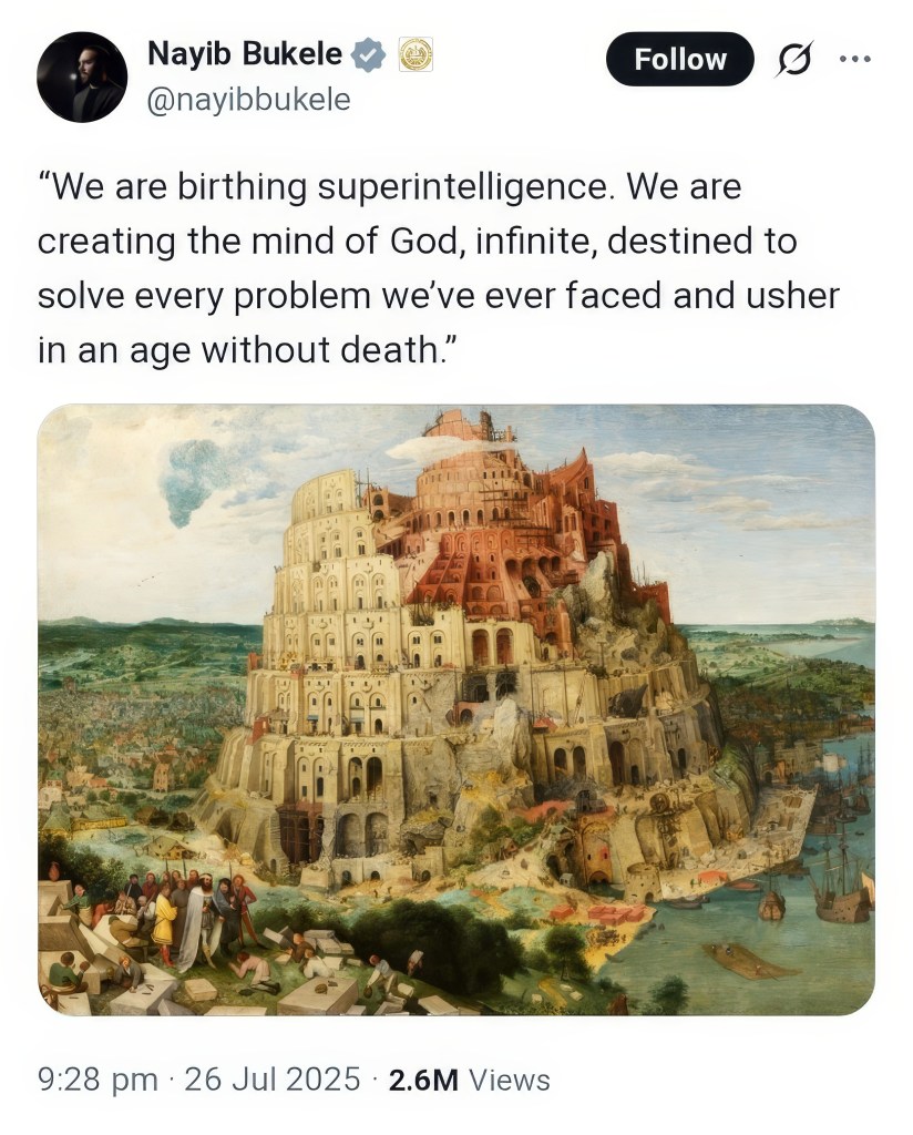 If you think that sounds far-fetched, the connection with Babel is even advocated by those propagandizing Transhumanism. In a tweet on the social media platform, “X” (formerly Twitter) on 26th July 2025, Nayib Bukele, President of El Salvador, shared an image of the Tower of Babel (see above) with the accompanying words: “We are birthing superintelligence. We are creating the mind of God, infinite, destined to solve every problem we’ve ever faced and usher in an age without death”. That is a 100% pure Transhumanist statement; and it shows the kind of humanistic hubris which characterizes those who propagate it.