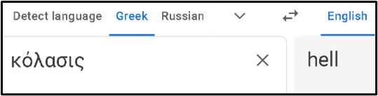 The word translated as ‘punishment’ there is κόλασις, kόlasis, which can also be translated as “torment”, as in the text: “There is no fear in love; but perfect love casts out fear, because fear involves torment” (1 John 4:18). It is surely no coincidence that the translation of kόlasis in modern Greek is, in fact, “hell” (see image, above, from Google Translate)! It is also used in Greece today in a colloquial manner, e.g., “ω, κόλαση! Πού θα τελειώσει όλο αυτό?” (“oh, hell—where will this all end?”). It is so obvious that we are dealing with something devastating and neverending.