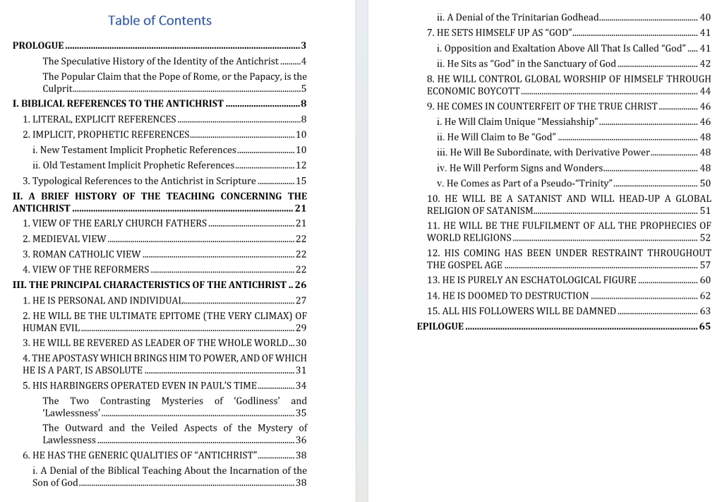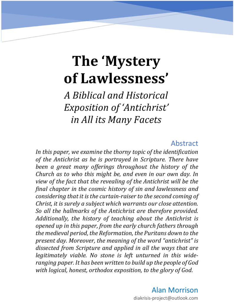 “In this paper, we examine the thorny topic of the identification of the Antichrist as he is portrayed in Scripture. There have been a great many offerings throughout the history of the Church as to who this might be, and even in our own day. In view of the fact that the revealing of the Antichrist will be the final chapter in the cosmic history of sin and lawlessness and considering that it is the curtain-raiser to the second coming of Christ, it is surely a subject which warrants our close attention. So all the hallmarks of the Antichrist are therefore provided. Additionally, the history of teaching about the Antichrist is opened up in this paper, from the early church fathers through the medieval period, the Reformation, the Puritans down to the present day. Moreover, the meaning of the word “antichrist” is dissected from Scripture and applied in all the ways that are legitimately viable. No stone is left unturned in this wide-ranging paper. It has been written to build up the people of God with logical, honest, orthodox exposition, to the glory of God”.