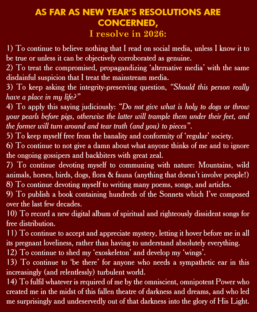 Well, I did fulfil all my resolutions for 2025. Now I carry some worthy ones over from last year as still being valid for 2026 and I also add some new ones. You will see them in the accompanying image. Wishing one and all a spiritually and emotionally growthful year ahead, and thank you for being there and encouraging me to write and write and write and write…