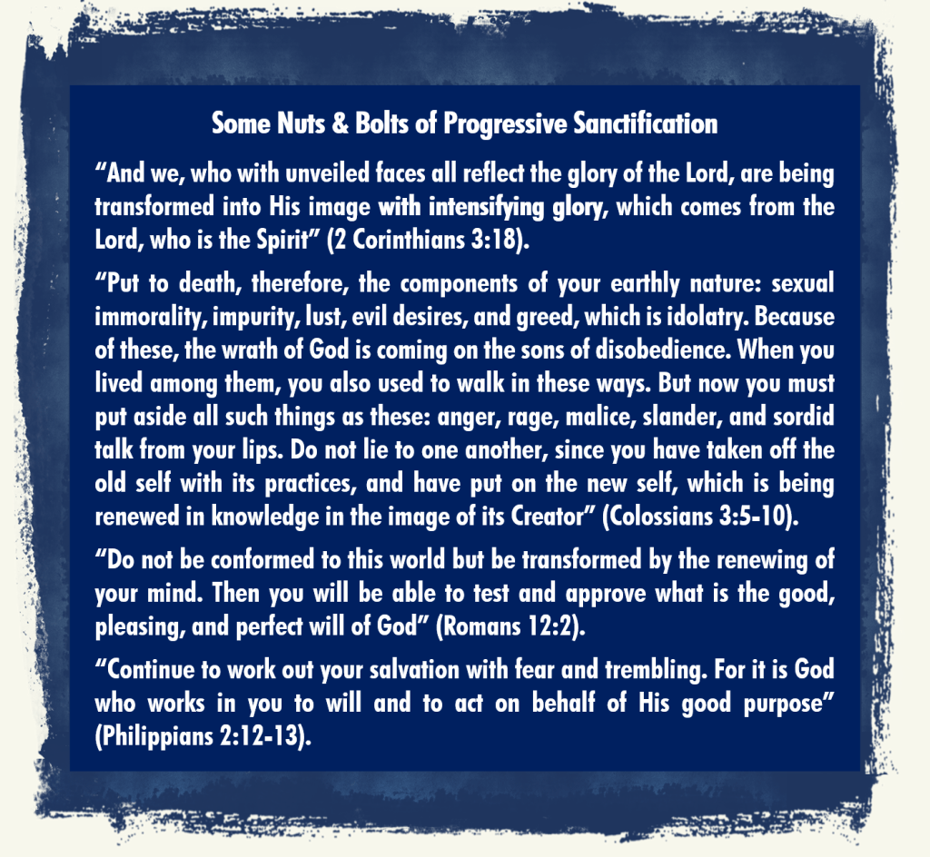 I am a disciple of Christ. Unashamedly so! Being a disciple of Christ means that one does one’s absolute best to follow the teachings of Christ, to “come after” Him (Matthew 16:24). Following the teachings of Christ holds one to a certain standard of behaviour — not merely outward behaviour because that can easily be faked, either consciously or unconsciously; but one’s inner world too, the way one’s mind works, the way one regards the world outside, the way one deals with impure or unfitting thoughts, the way one leaves behind all the old affiliations and prejudices, the way one shuns anything which can interfere with one’s spiritual development, the way one wrestles with and overcomes any residual personality quirks and disorders left over from one’s unregenerate life which have stamped themselves into one’s being (which includes any so-called “trauma-patterning”). One doesn’t always succeed right away, and it is certainly not an overnight job (although some elements do drop away quicker than others). But thanks to penitence and forgiveness and the ever-ready presence of the Holy Spirit, one improves and, above all, one wants to improve. That is the main element in progressive sanctification: Improvement. One can see in oneself a tangible trajectory of betterment — what Paul calls “intensifying glory” (2 Corinthians 3:18). It is nothing to brag about. It is nothing on which to rest one’s laurels. But it is a quiet encouragement to oneself that the Spirit is working within. You can see the evidence of it every day, and it sometimes amazes you to see how it all works (not to mention that this steady improvement also increases your faith). There will be slips and stumbles along the way, but these are simply incentives to the betterment which I have mentioned above.
