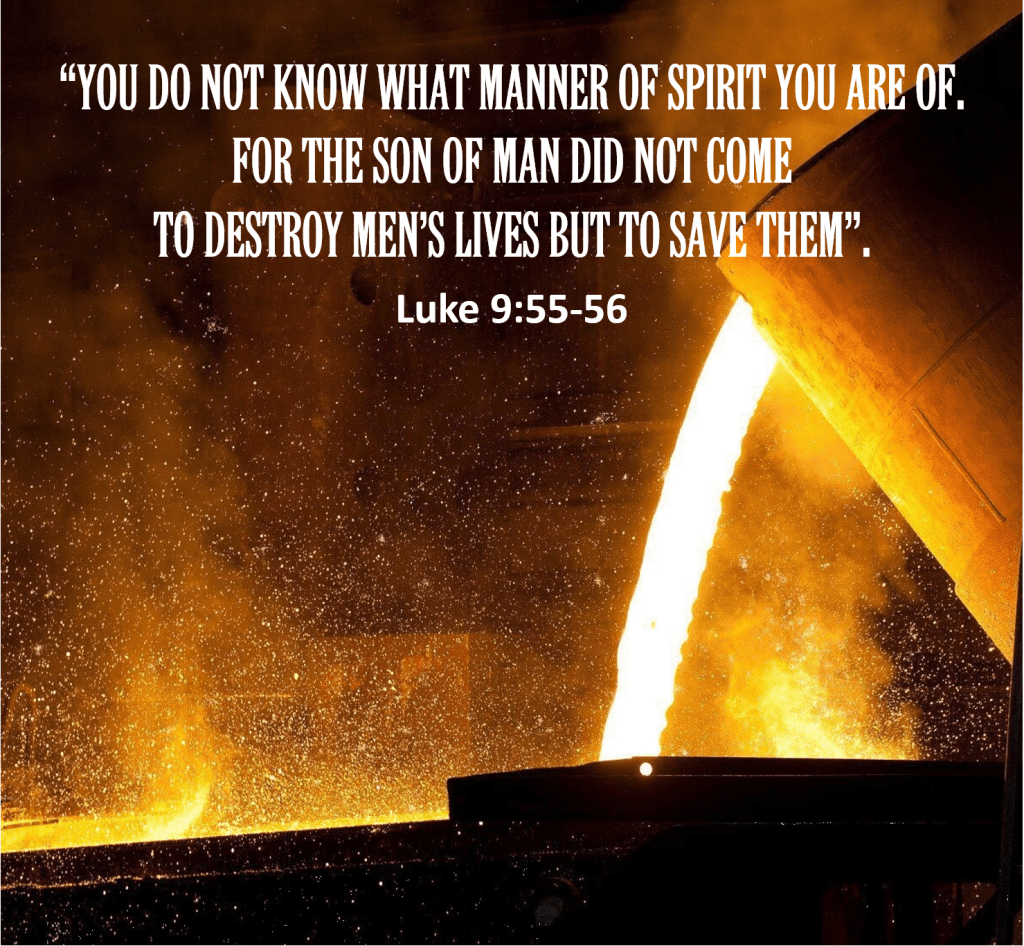 When James and John wanted to command fire to come down from heaven and destroy the Samaritans, Jesus “rebuked them, and said, ‘You do not know what manner of spirit you are of. For the Son of Man did not come to destroy men’s lives but to save them’” (Luke 9:55-56).