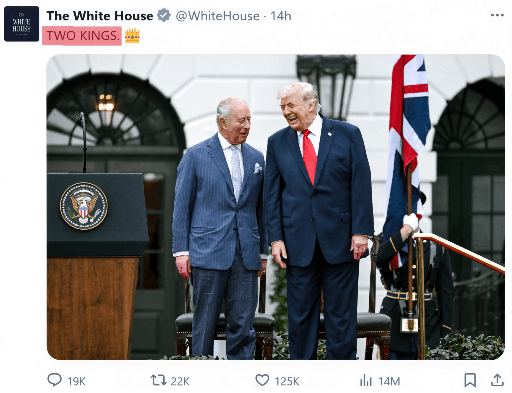 So that jamboree in Congress was all just a show — all designed to boost Chump’s ego and nothing more. This is borne out by the fact that the following day, the White House put an image on Twitter (now even more stupidly known as “X”) which showed King Charles with Trump and above the image were the words “TWO KINGS” (see attached image where I have highlighted those words, top left) and a crown emoji next to that. That was predictable and I had been waiting for it. There is much more that is predictable too. But I will not bore you with that here. I’ve said it all before anyway. We are watching a satanic clown-show that will one day in the not-too-distant future be seen for what it is: A horror-movie being acted out in real-time. Watch this space…